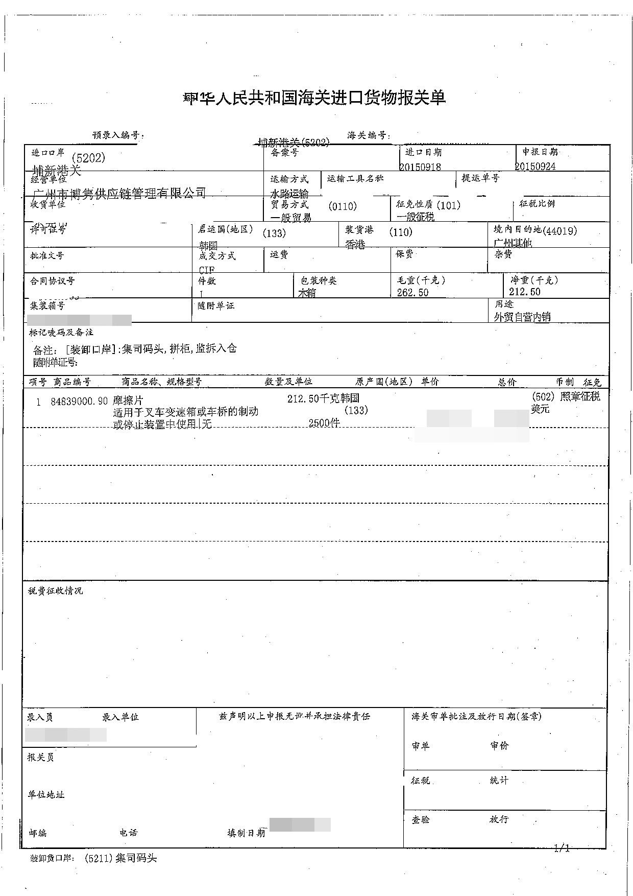 摩擦片是指芯片和摩擦襯片或摩擦材料層組成的組件,廣泛應用于機械工程、機械零件和離合器領域。2016年我國裝在蹄片上的制動摩擦片進出口貿易總量265872440千克,2017年進出口貿易總量294941797千克;2018年1季度進出口貿易總量69525957千克。博裕擁有豐富的摩擦片進口報關手續流程操作經驗及案例,現在為大家詳細介紹一下關于摩擦片進口報關那些事兒。