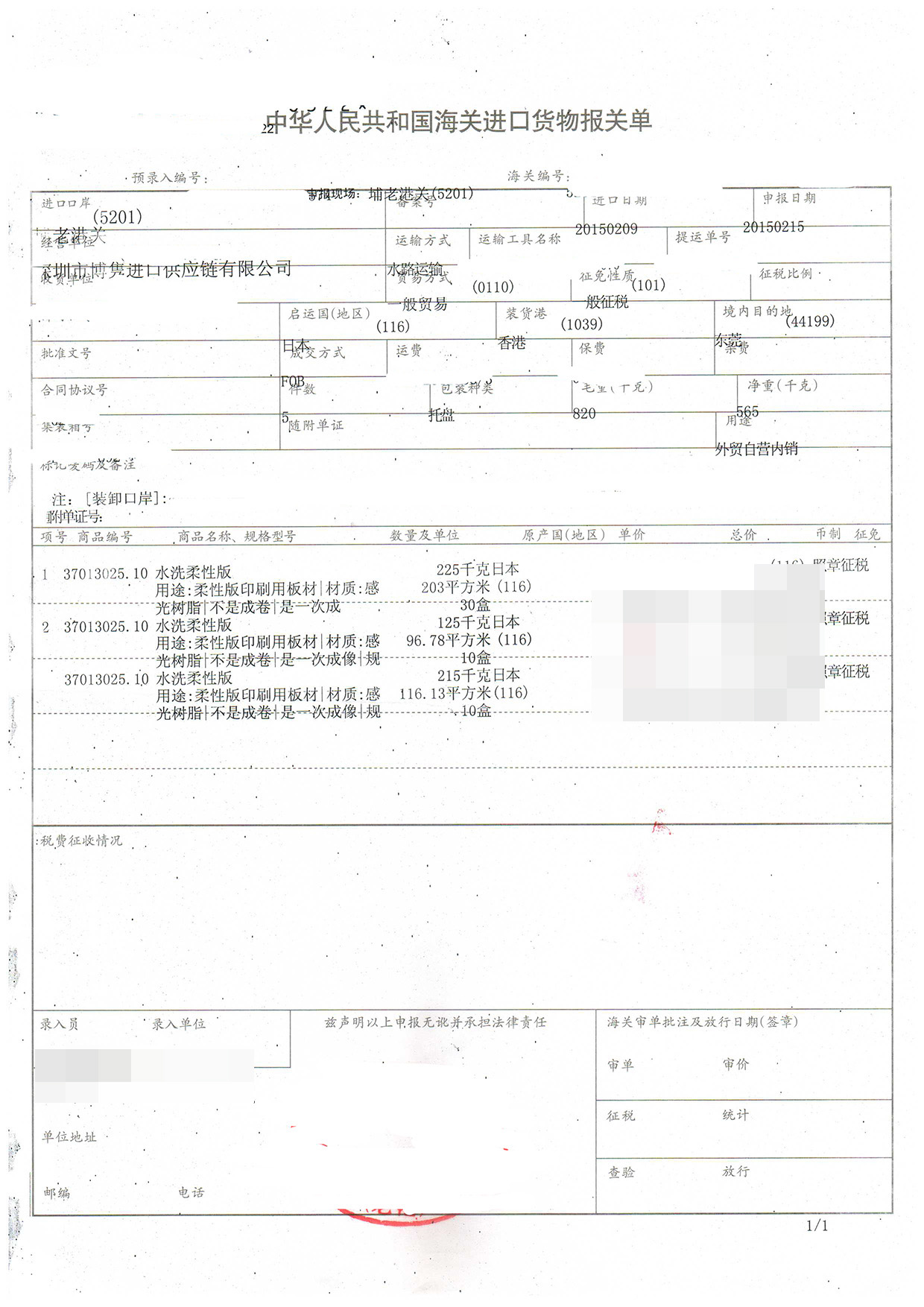 三、水洗柔性版進口報關案例展示