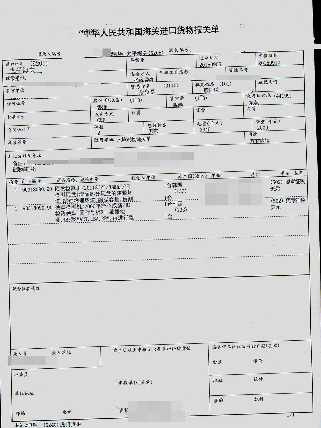 一、舊硬盤檢測機進口報關手續資料