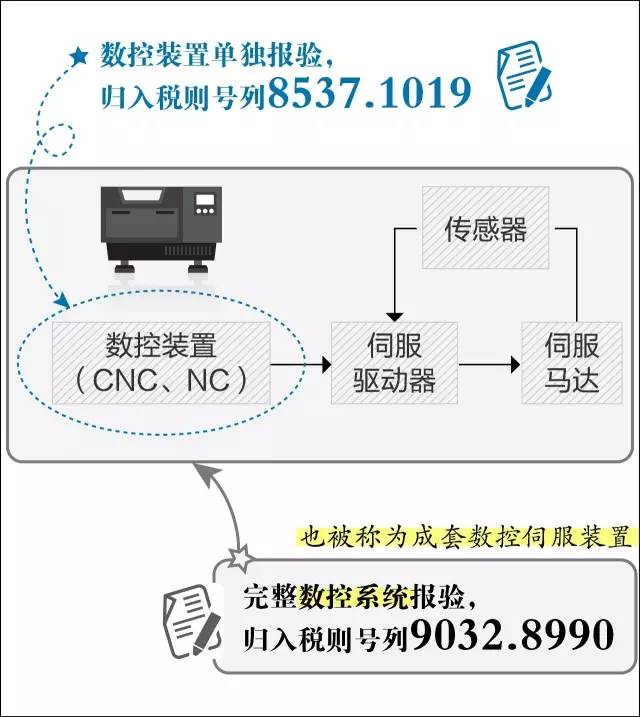 同時,由8537.1019的“數控裝置”、9032.8990的“伺服驅動器”、85.01項下“伺服馬達以及傳感器、線纜等附件”(不管這些附件是否一同報驗)構成的成套裝置(行業稱之為“數控系統”),無論對其如何命名,均應歸入稅號9032.8990。P.S.:在9032.8990.50/70列名中,相同商品使用“成套數控伺服裝置”的名稱來替代“數控系統”。