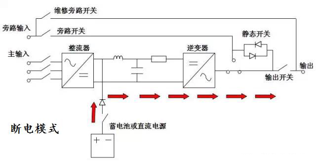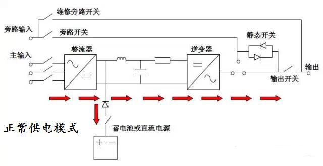 當(dāng)市電輸入正常時,UPS 將市電穩(wěn)壓后供應(yīng)給負(fù)載使用,此時的UPS就是一臺交流式電穩(wěn)壓器,同時它還向機內(nèi)電池充電;當(dāng)市電中斷(事故停電)時, UPS 立即將電池的直流電能,通過逆變器切換轉(zhuǎn)換的方法向負(fù)載繼續(xù)供應(yīng)220V交流電,使負(fù)載維持正常工作并保護負(fù)載軟、硬件不受損壞。從而達到不間斷供電的目的。