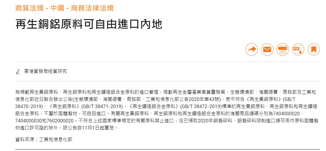香港再生銅鋁原料可自由進口到大陸